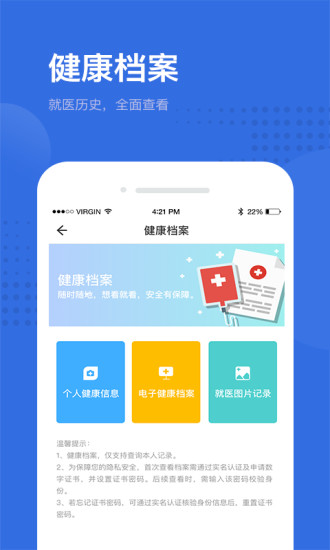 1、统一管理个人健康档案,病历信息实时同步,便于医生精准诊疗和用户长期健康管理。